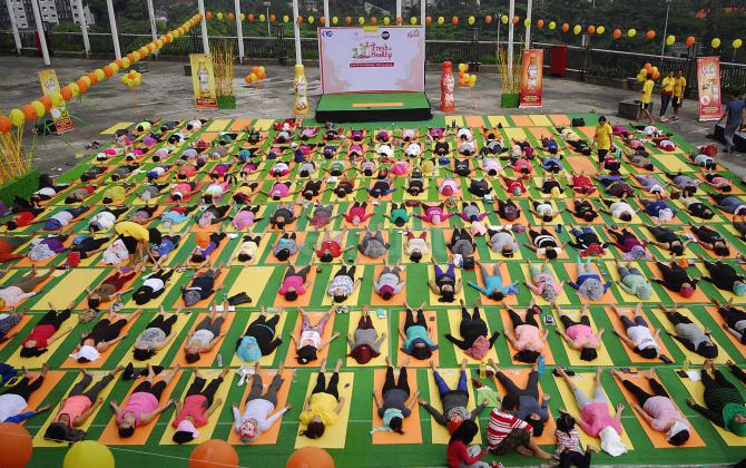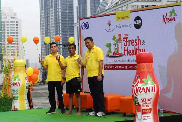 Michael Bliss, public Relations OT, bersama Yudhi Widdyantoro, Founder komunitas Yoga Gembira dan Donny,managing director Kiranti mengangak kiranti usai Yoga in the Air di rooftop Plaza Semanggi, Jakarta, Sabtu (30/4/2016). Kegiatan ini dilakukan sebagai bentuk kampanye "Stay fresh and healthy with Kiranti" yang bertujuan mengajak wanita Indonesia untuk memilih cara yang sehat saat datang bulan.