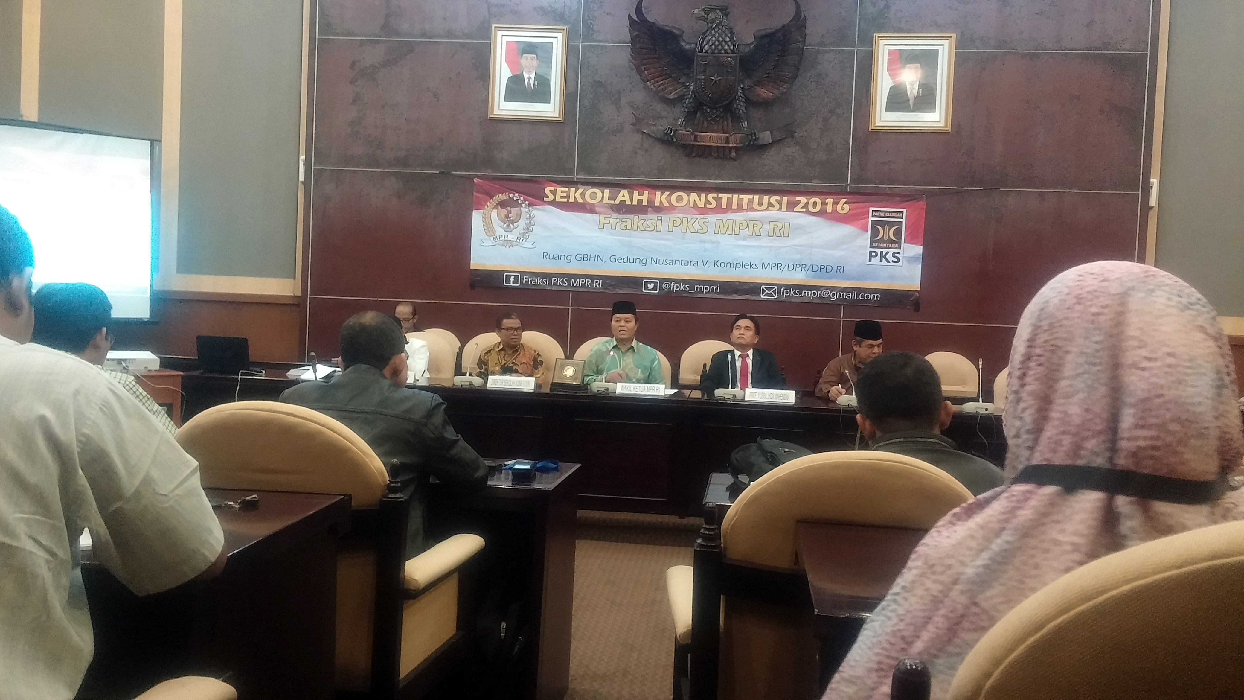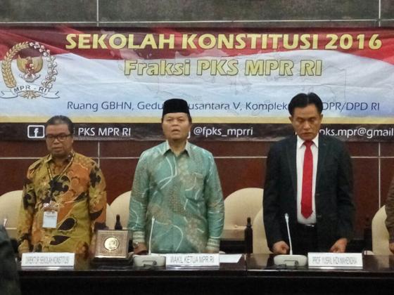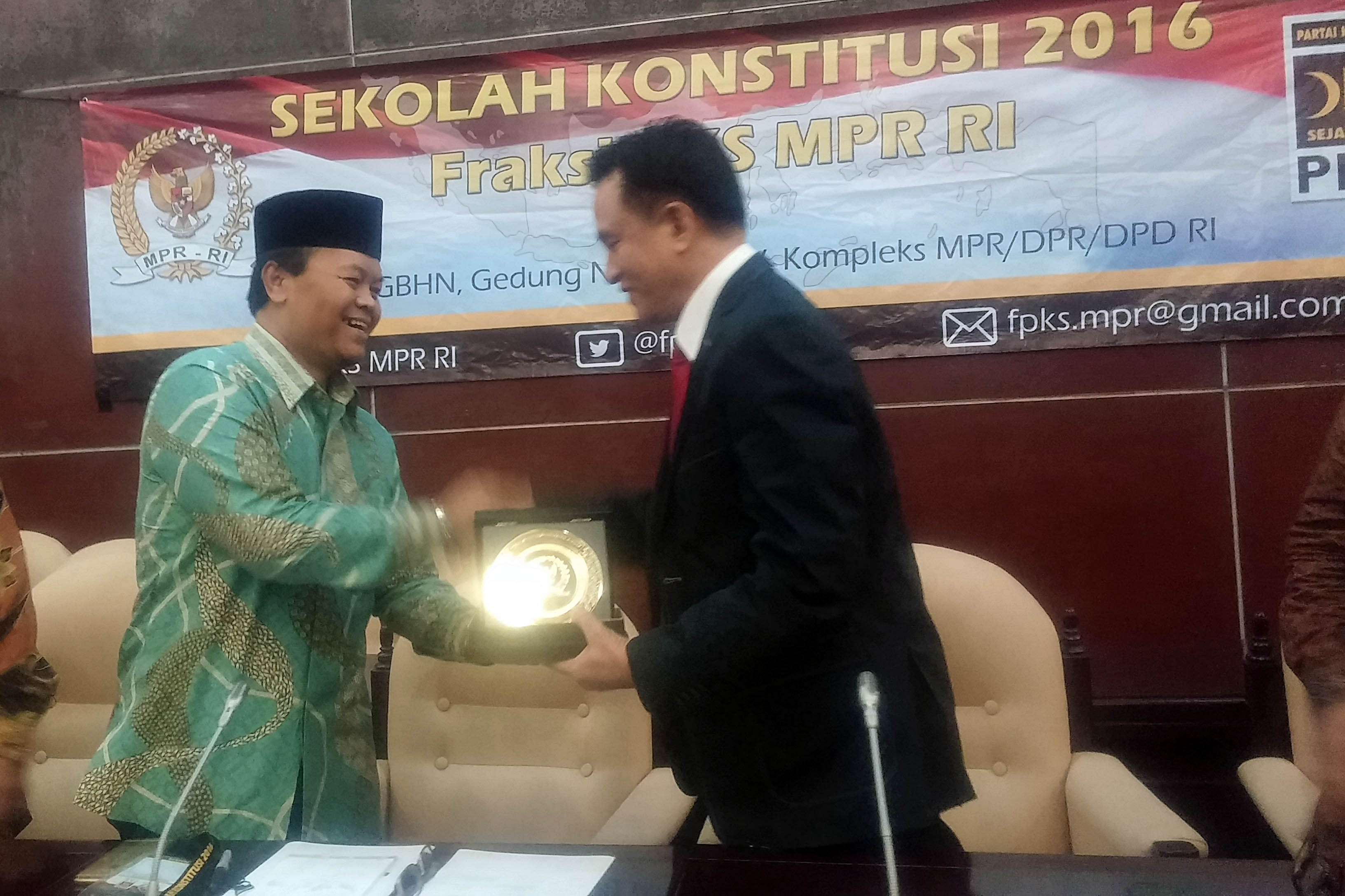 Wakil Ketua MPR RI Hidayat Nur Wahid memberikan kenang-kenangan berupa plakat kepada Pemateri Kuliah Perdana Sekolah Konstitusi Fraksi PKS MPR RI Yusril Ihza Mahendra di Ruang GBHN Gedung Nusantara V, Kompleks Parlemen, Senayan, Jakarta, Senin (20/6). Sekolah konstitusi itu sesuai dengan amanat UU No 17 tahun 2014 juncto UU No 42 tahun 2014 tentang Majelis Permusyawaratan Rakyat, Dewan Permusyaratan Rakyat, Dewak Perwakilan Daerah, dan Dewan Perwakilan Rakyat Daerah (UU MD3). AKTUAL/HO