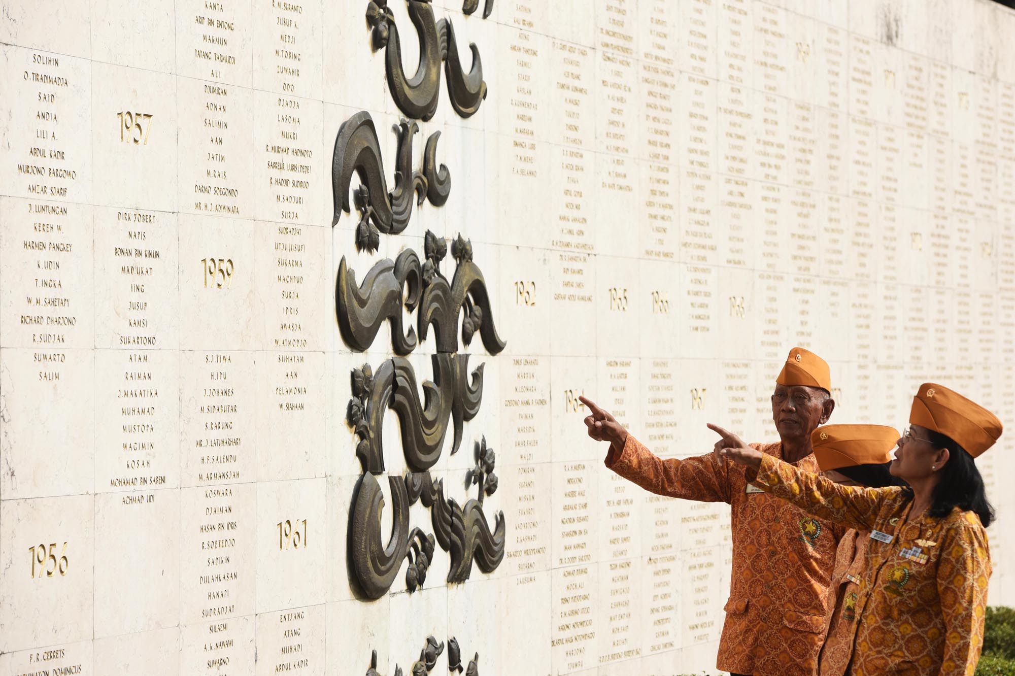 Sejumlah veteran perang melihat dinding berisi nama-nama pahlawan yang telah gugur usai melakukan ziarah di Taman Makam Pahlawan Kalibata, Jakarta, Senin (10/8). Ziarah tersebut bertujuan untuk mengingat kembali perjuangan mereka serta rekan-rekannya yang telah gugur dalam merebut dan mempertahankan kemerdekaan Indonesia. ANTARA FOTO/Akbar Nugroho Gumay/pras/15