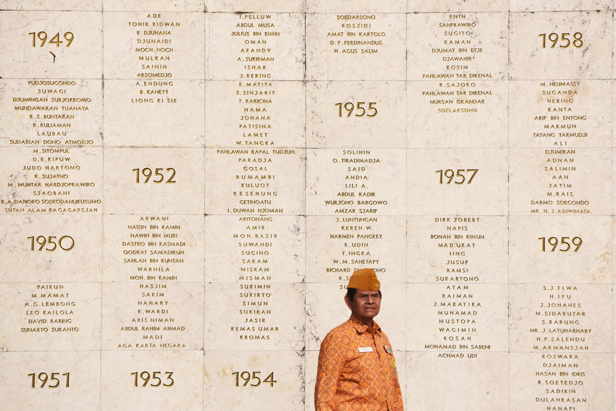 Seorang veteran perang melintasi dinding berisi nama-nama pahlawan yang telah gugur usai melakukan ziarah di Taman Makam Pahlawan Kalibata, Jakarta, Senin (10/8). Ziarah tersebut bertujuan untuk mengingat kembali perjuangan mereka serta rekan-rekannya yang telah gugur dalam merebut dan mempertahankan kemerdekaan Indonesia. ANTARA FOTO/Akbar Nugroho Gumay/pras/15