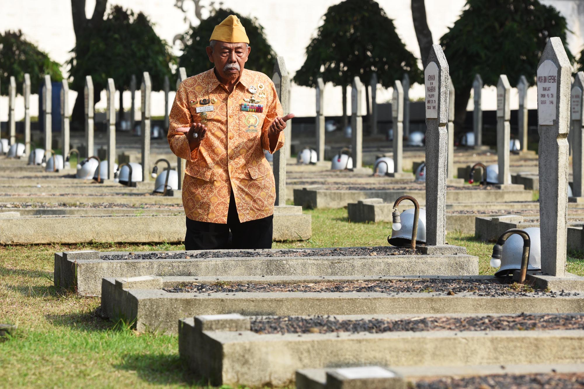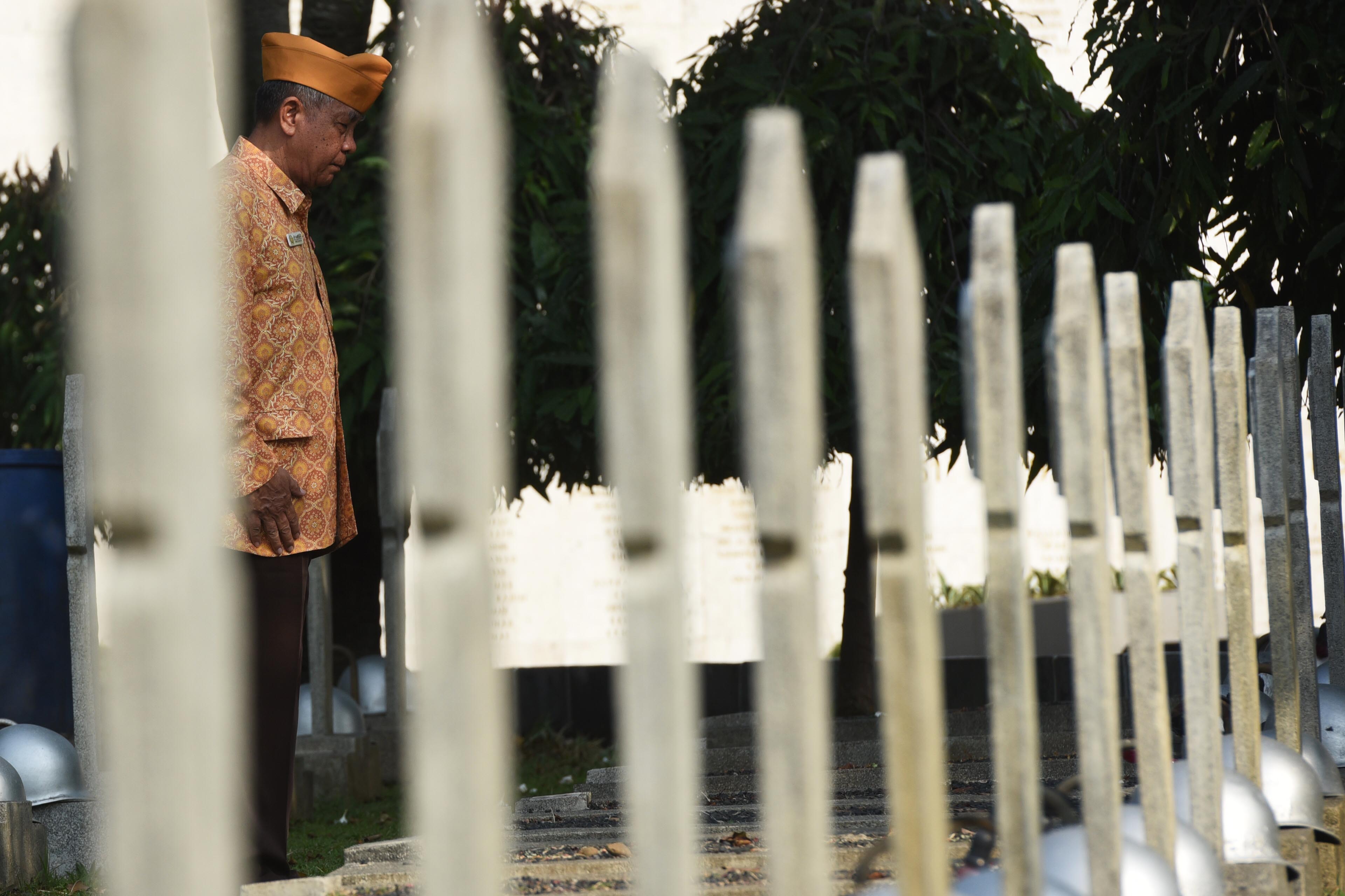 Seorang veteran perang berdoa di depan makam rekannya saat melakukan ziarah di Taman Makam Pahlawan Kalibata, Jakarta, Senin (10/8). Ziarah tersebut bertujuan untuk mengingat kembali perjuangan mereka serta rekan-rekannya yang telah gugur dalam merebut dan mempertahankan kemerdekaan Indonesia. ANTARA FOTO/Akbar Nugroho Gumay/pras/15
