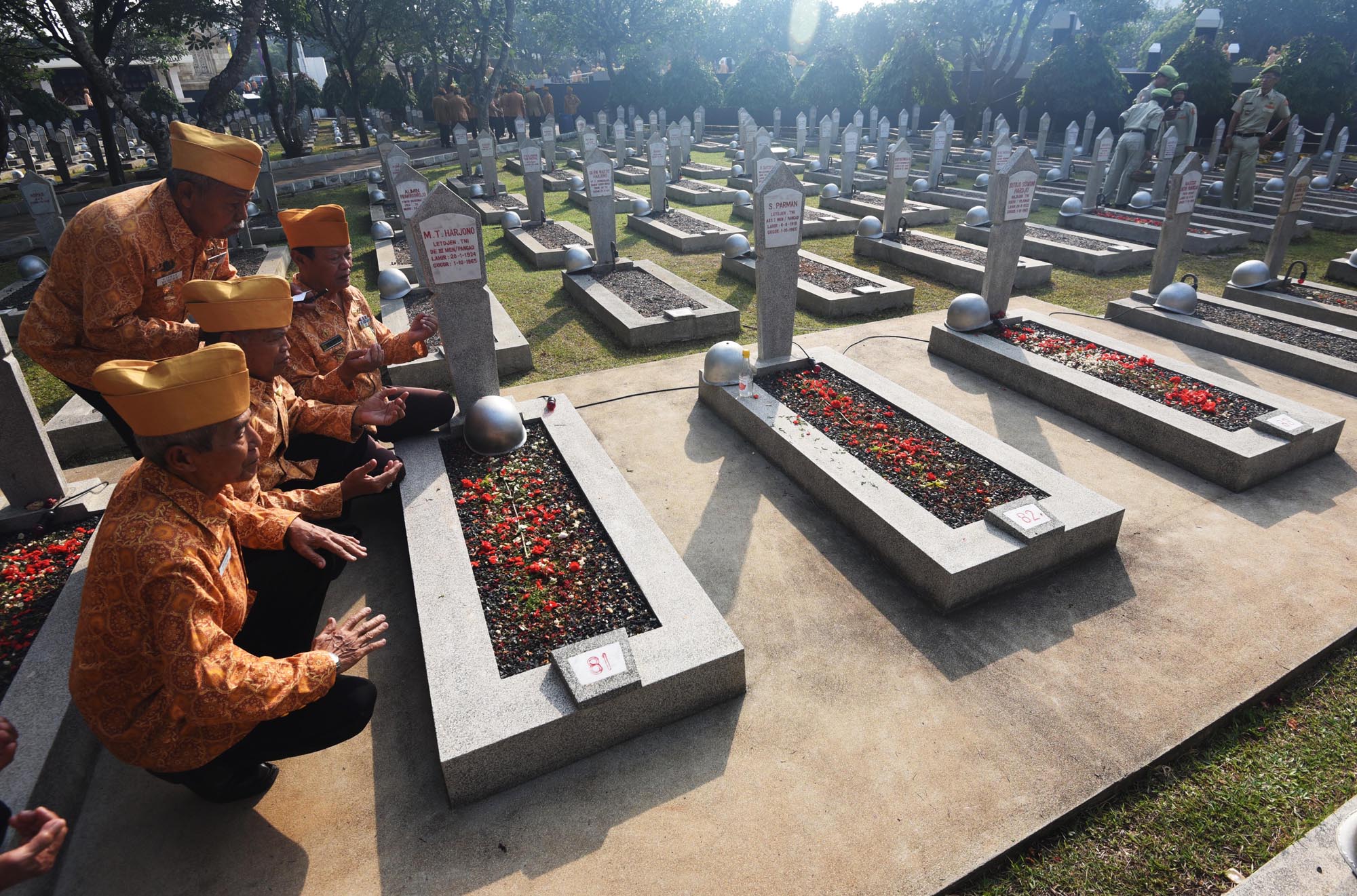 Sejumlah veteran perang berdoa di depan makam rekannya saat melakukan ziarah di Taman Makam Pahlawan Kalibata, Jakarta, Senin (10/8). Ziarah tersebut bertujuan untuk mengingat kembali perjuangan mereka serta rekan-rekannya yang telah gugur dalam merebut dan mempertahankan kemerdekaan Indonesia. ANTARA FOTO/Akbar Nugroho Gumay/pras/15