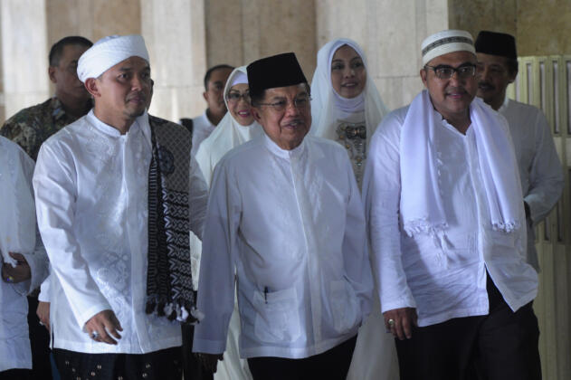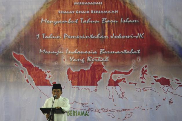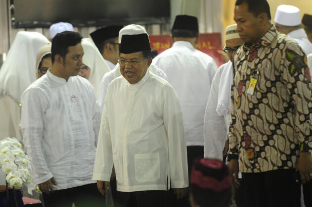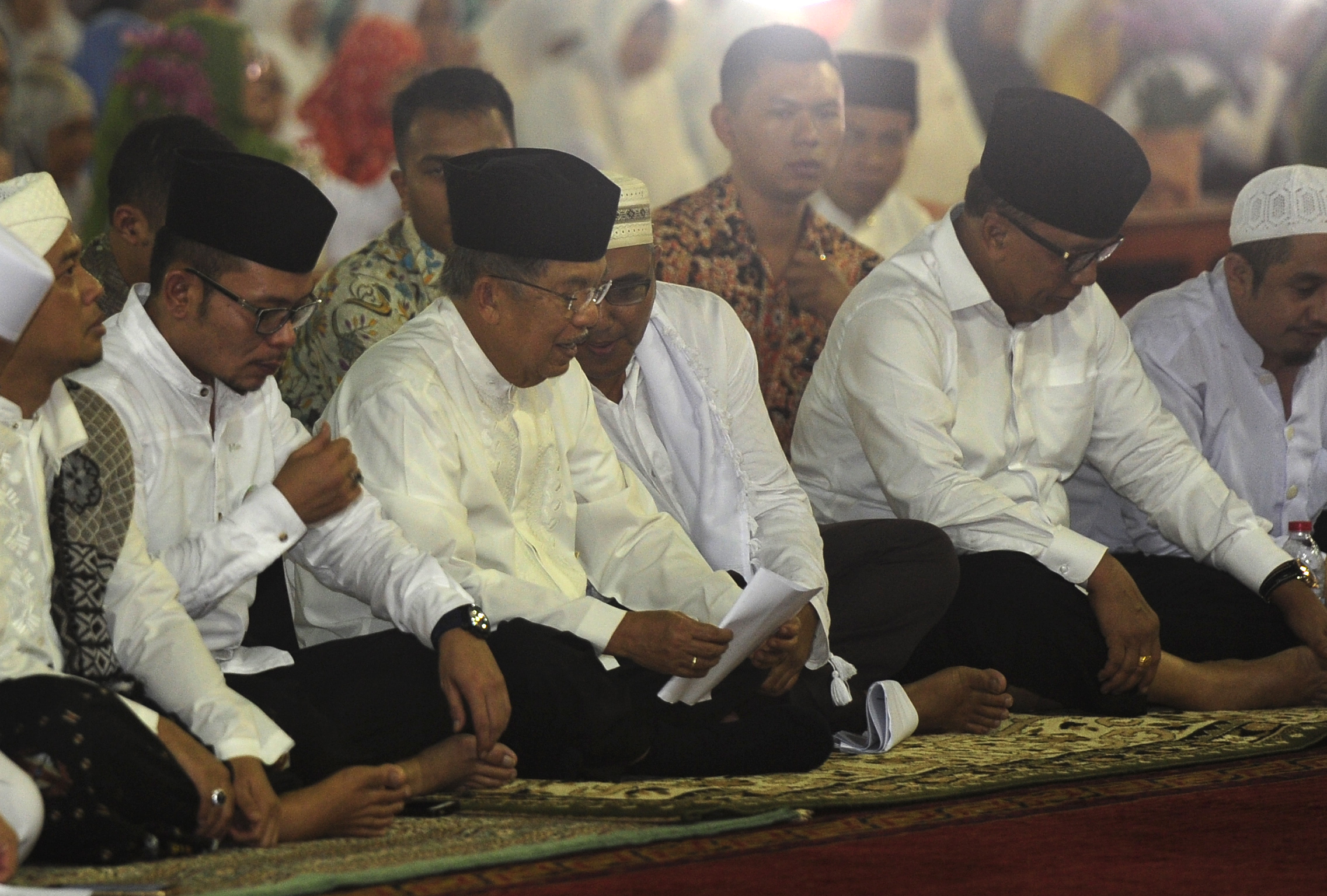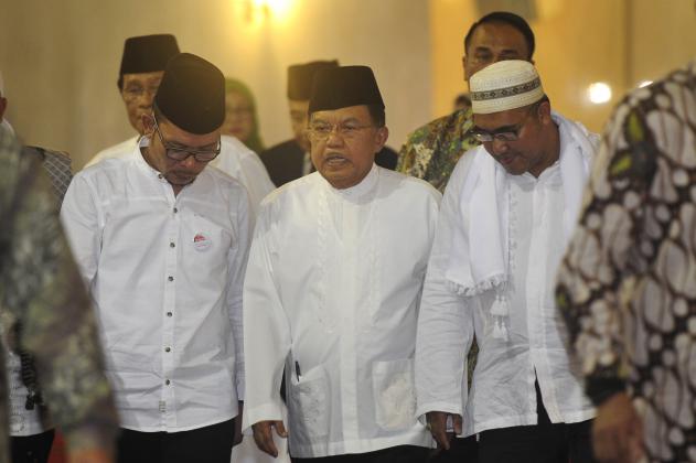 Wapres Jusuf Kalla (tengah) menghadiri zikir dan tausiah akbar di Masjid Istiqlal, Jakarta, Rabu (14/10). Kegiatan yang diikuti ratusan jamaah dalam rangka menyambut Tahun Baru Islam 1437 Hijriyah itu wapres menghimbau masyarakat menjunjung sikap bertoleransi antar umat beragama di Indonesia. ANTARA FOTO/Wahyu Putro A/nz/15