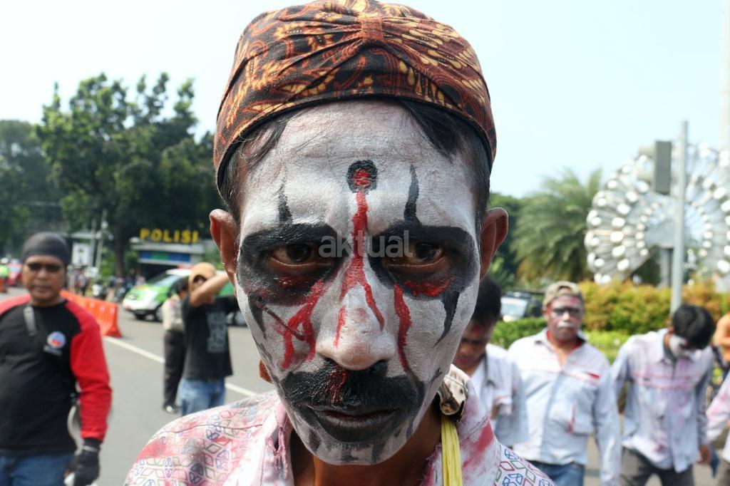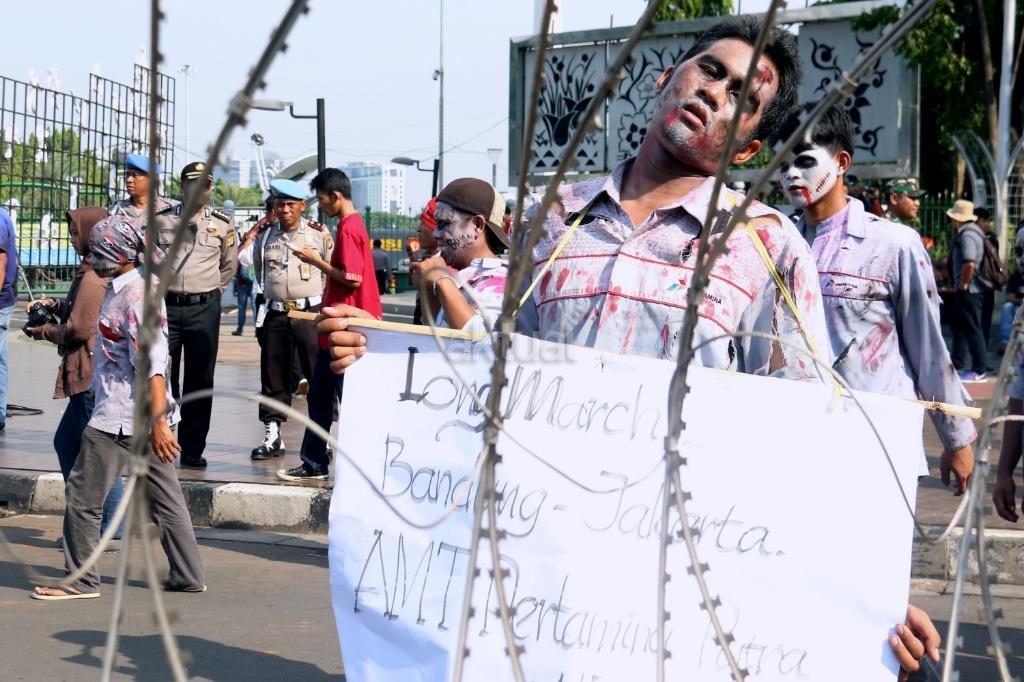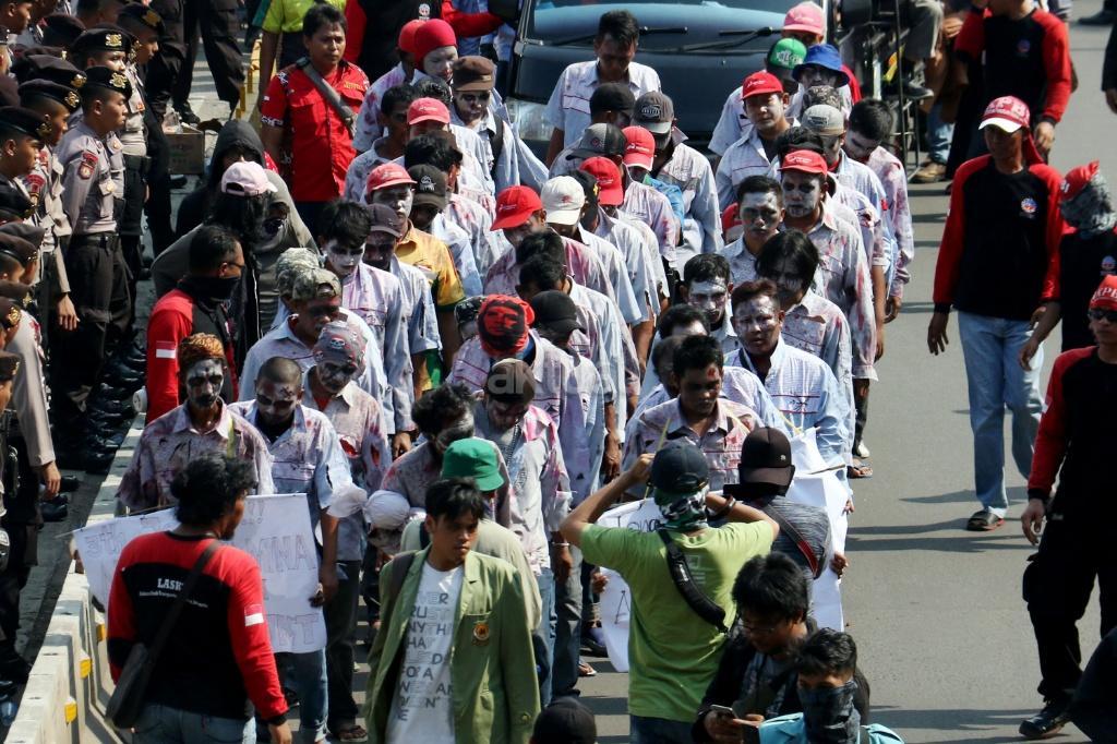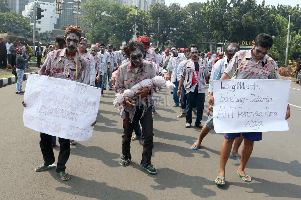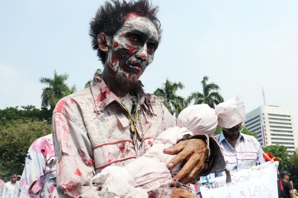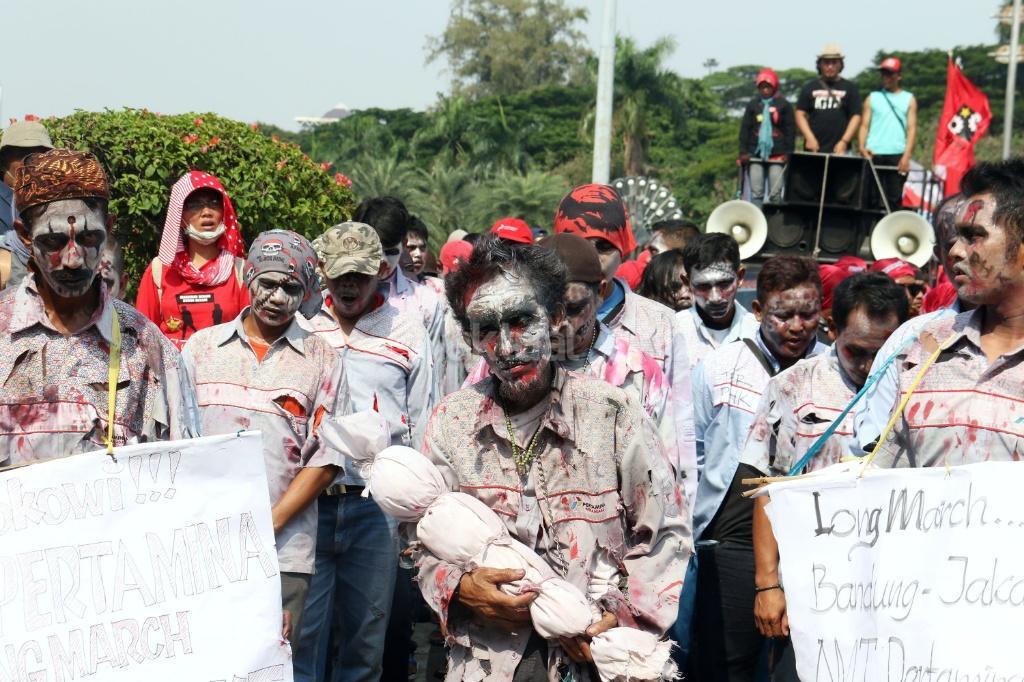 Puluhan zombi buruh Pertamina yang tergabung dalam Konfederasi Persatuan Buruh Indonesia (KPBI) melakukan aksi long march menuju Istana Merdeka, Jakarta, Jumat (20/10/2017). Setelah tujuh hari menempuh aksi long march Bandung-Jakarta, zombi buruh Pertamina mendatangi Presiden Joko Widodo untuk menagih janji Jokowi tentang “Tiga layak untuk buruh. AKTUAL/Munzir