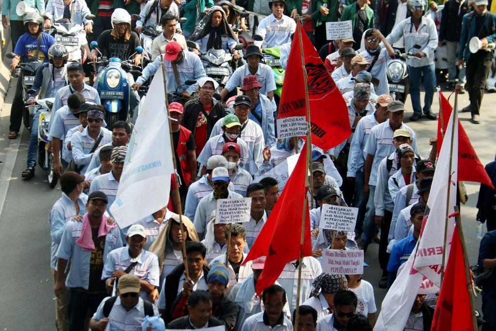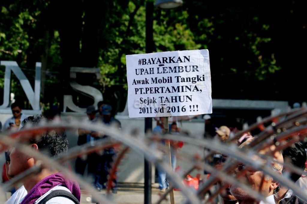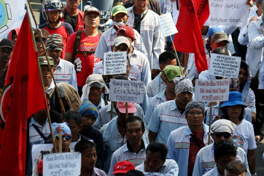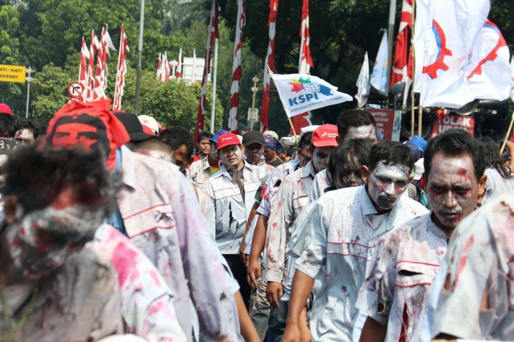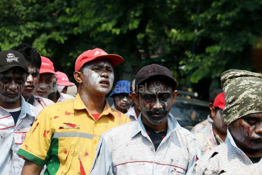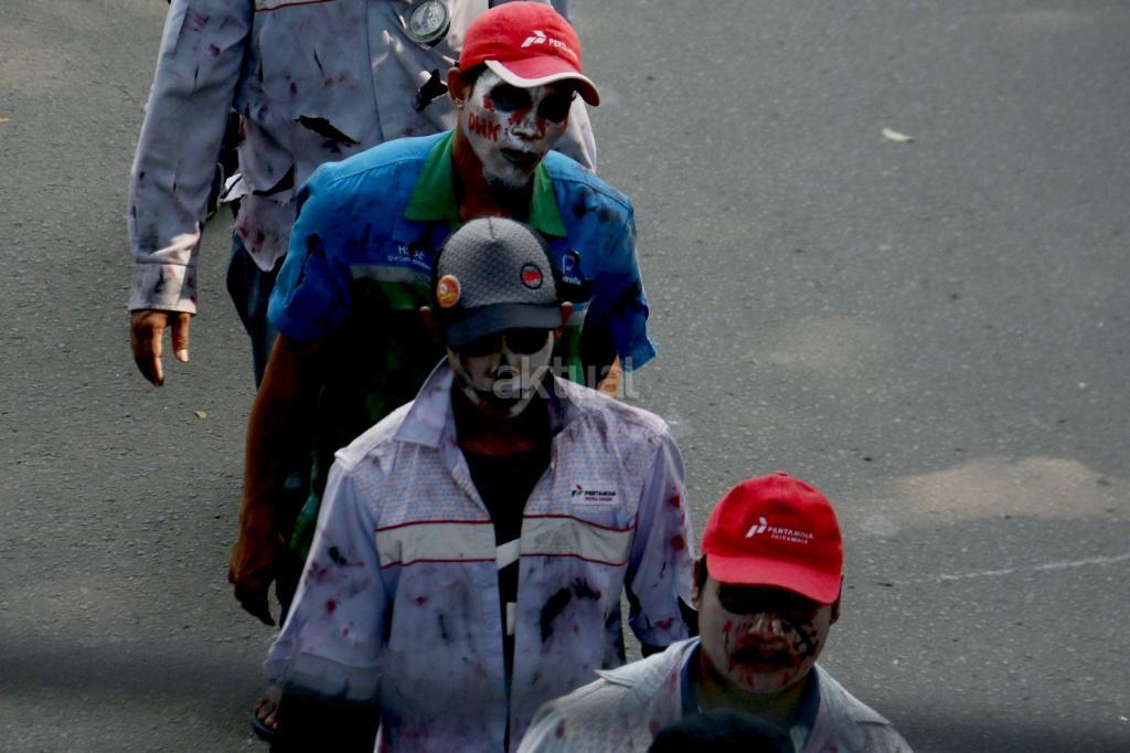 Puluhan zombi buruh Pertamina yang tergabung dalam Konfederasi Persatuan Buruh Indonesia (KPBI) melakukan aksi long march menuju Istana Merdeka, Jakarta, Jumat (20/10/2017). Setelah tujuh hari menempuh aksi long march Bandung-Jakarta, zombi buruh Pertamina mendatangi Presiden Joko Widodo untuk menagih janji Jokowi tentang “Tiga layak untuk buruh. AKTUAL/Munzir