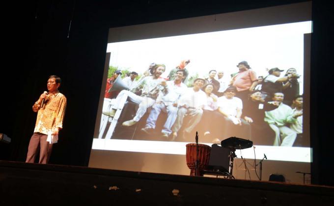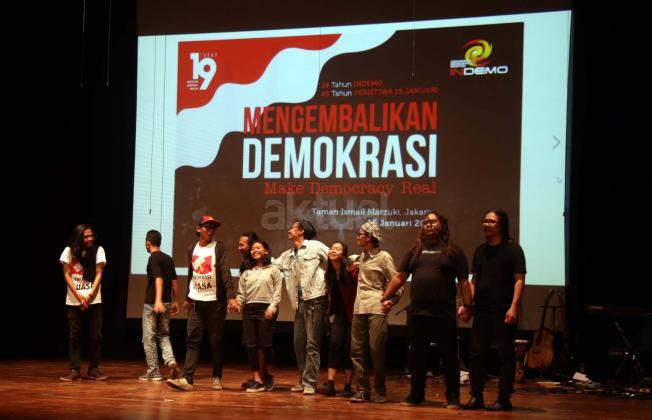 Kelompok seni Guntur saat usai saat melakukan baca puisi saat dalam peringatan HUT ke-19 Indonesian Democracy Monitor (Indemo) dan peringatan 45 Tahun Peristiwa Malari di Taman Ismail Marzuki, Jakarta, Selasa (15/1/2019) malam. Hariman Siregar menegaskan, Indonesia membutuhkan pemimpin yang memahami hakikat demokrasi. Tak hanya demokrasi prosedural, tetapi hakikat demokrasi, yakni menyejahterakan rakyat dengan pemerataan pembangunan. AKTUAL/Tino Oktaviano