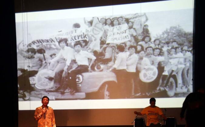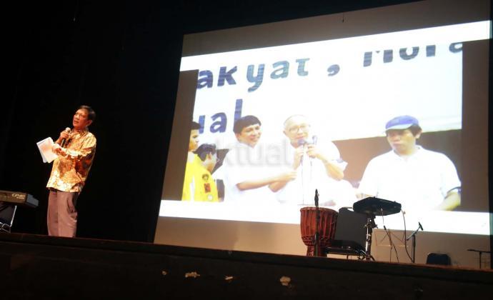 Tokoh peristiwa Malapetaka 15 Januari (Malari) l, Hariman Siregar, saat berpidato dalam peringatan HUT ke-19 Indonesian Democracy Monitor (Indemo) dan peringatan 45 Tahun Peristiwa Malari di Taman Ismail Marzuki, Jakarta, Selasa (15/1/2019) malam. Hariman Siregar menegaskan, Indonesia membutuhkan pemimpin yang memahami hakikat demokrasi. Tak hanya demokrasi prosedural, tetapi hakikat demokrasi, yakni menyejahterakan rakyat dengan pemerataan pembangunan. AKTUAL/Tino Oktaviano